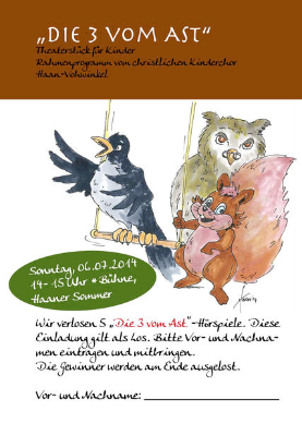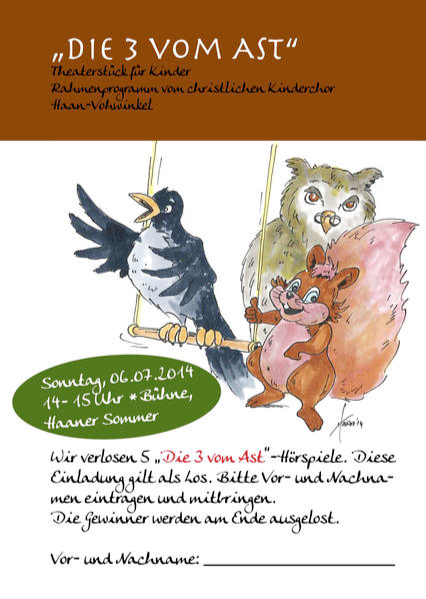 "Die 3 vom Ast" treten am 6.7.2014 auf der Bühne des Haaner Sommers auf. Die drei Freunde Eichhörnchen Waldemar, Eltster Kleopatra und die Eule Eulalia Hedwig Sofia Gräfin von Eichenhain-Uland regen zum Schmunzeln und Nachdenken an. Das Rahmenprogramm bestreitet der christliche Kinderchor Haan-Vohwinkel. Außerdem gibt es auch was zu gewinnen! Vor Ort werden 5 "Die 3 vom Ast"-Hörspiele verlost.