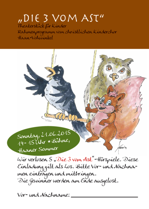 "Die 3 vom Ast" treten am 21.6.2015 wieder auf der Bühne des Haaner Sommers auf. Die drei Freunde Eichhörnchen Waldemar, Eltster Kleopatra und die Eule Eulalia Hedwig Sofia Gräfin von Eichenhain-Uland regen zum Schmunzeln und Nachdenken an. Das Rahmenprogramm bestreitet der christliche Kinderchor Haan-Vohwinkel. Außerdem gibt es auch etwas zu gewinnen! Vor Ort werden 5 "Die 3 vom Ast"-Hörspiele verlost.